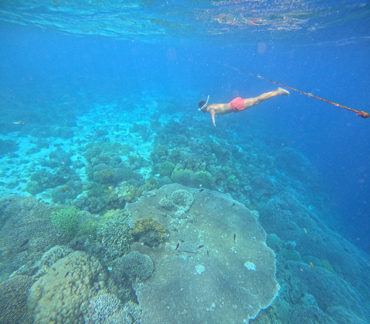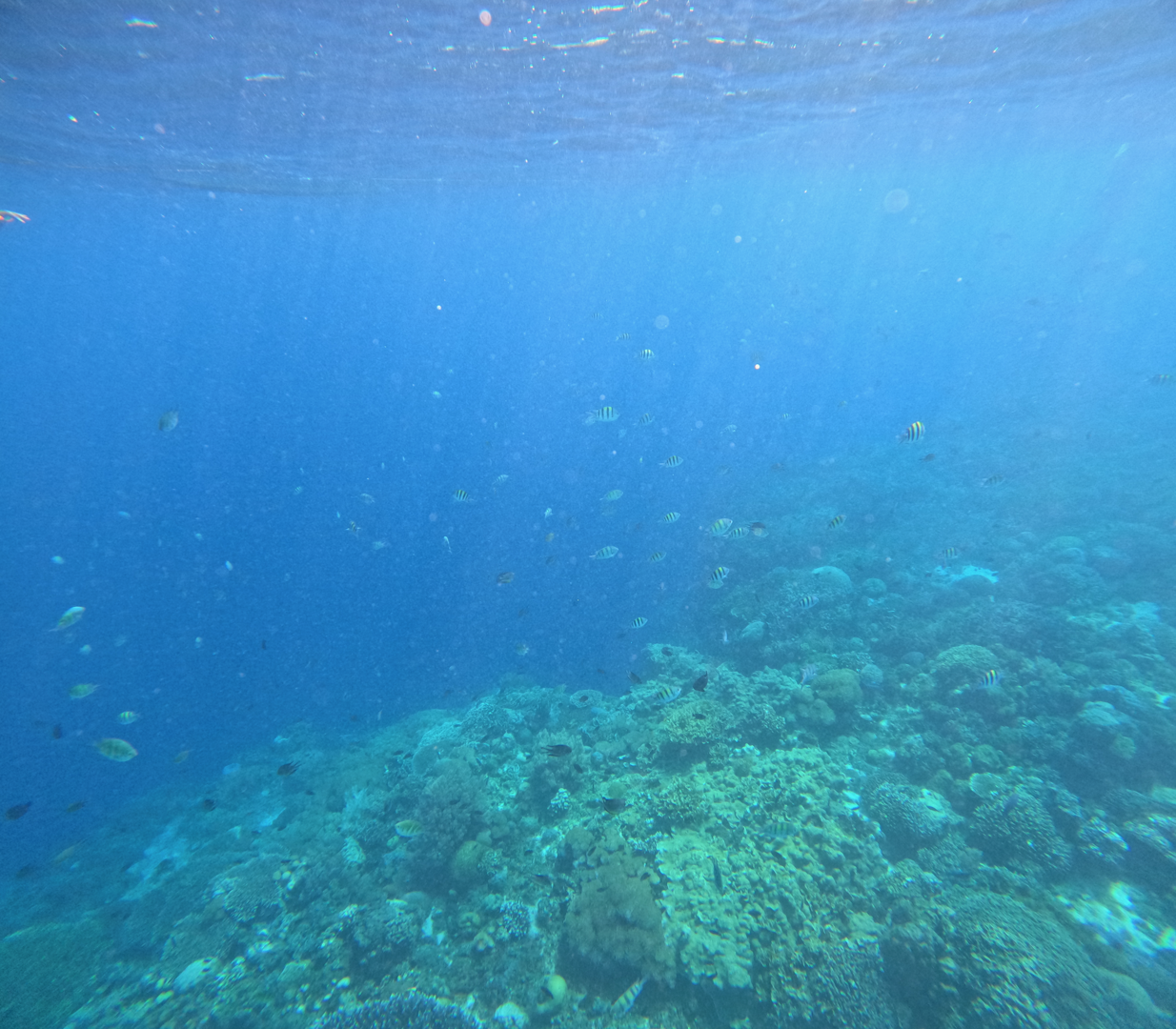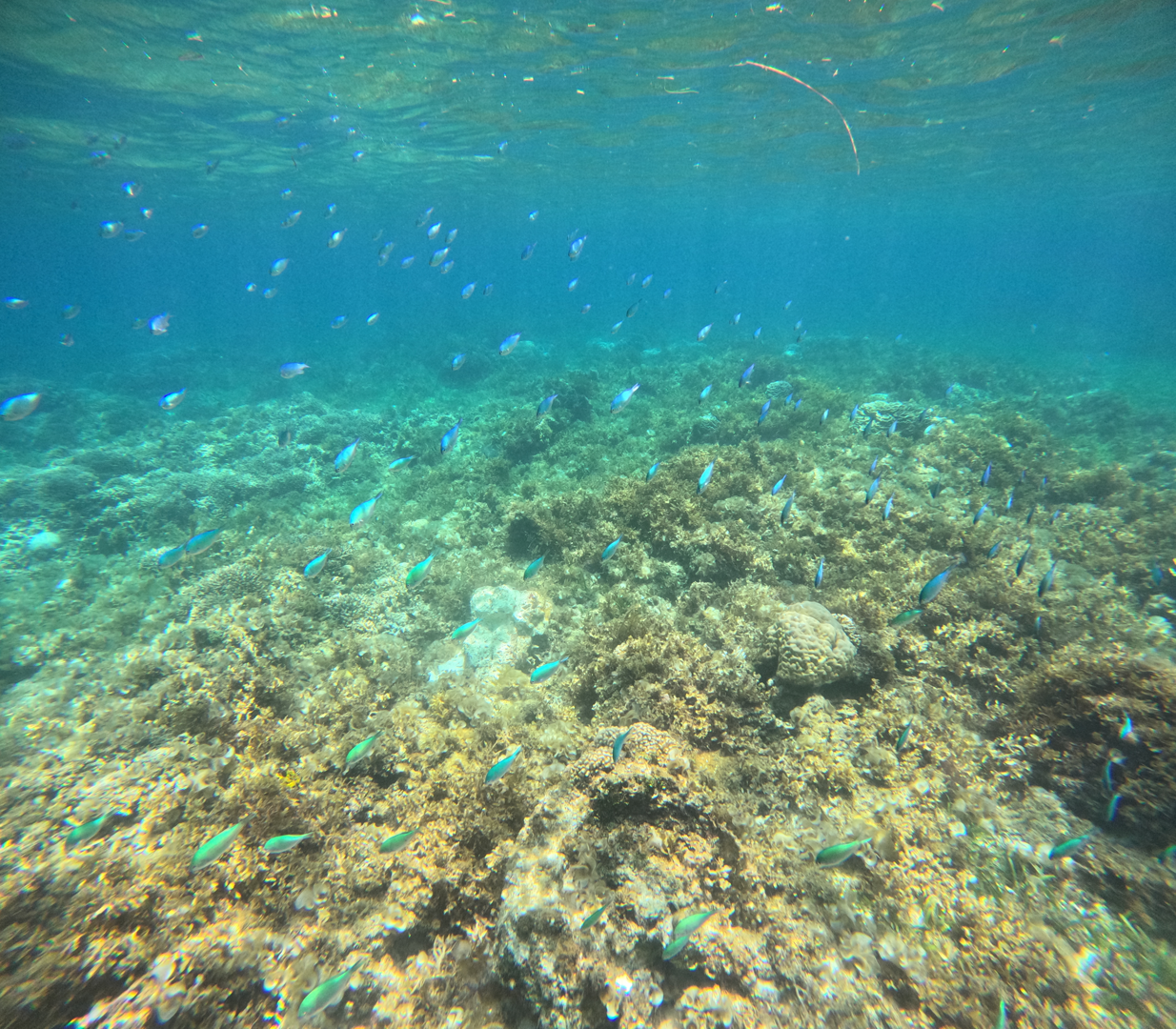 La experiencia fue brutal desde el primer momento. Bastaba meter la cabeza bajo el agua para ver una explosión de colores: corales, bancos de peces y una visibilidad increíble. En uno de los puntos tuvimos la suerte de ver dos tortugas marinas nadando tranquilamente a pocos metros de nosotros. Un momentazo difícil de olvidar.