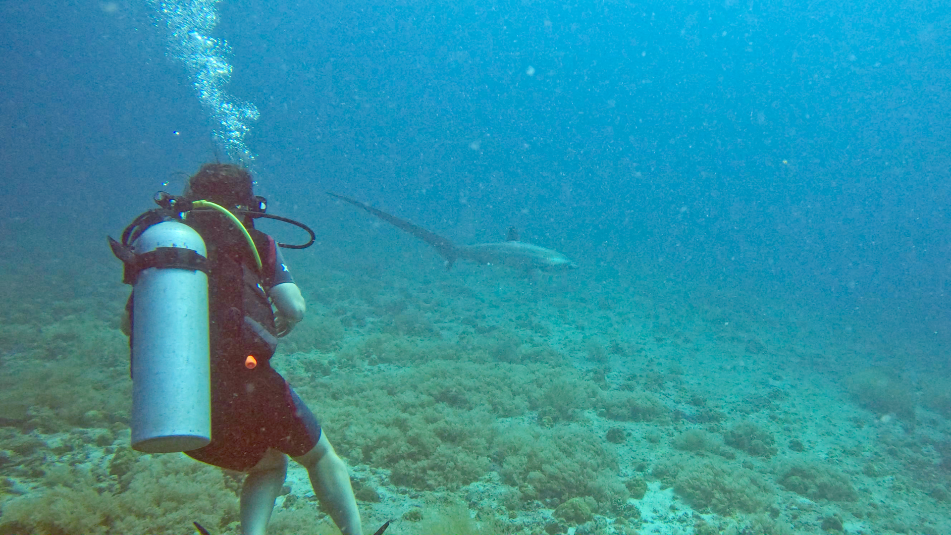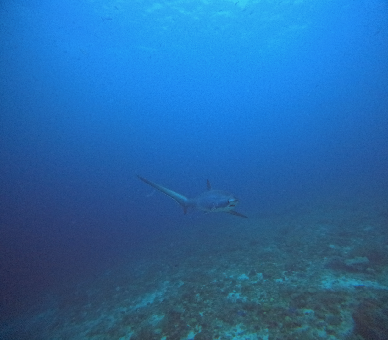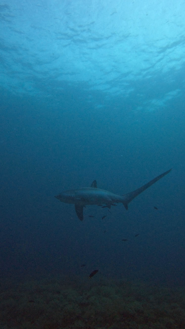 Un tiburón zorro. Elegante, enorme, con esa cola imposible. Poco después aparecieron más y nos quedamos completamente hipnotizados. Un momento de esos que sabes que no vas a olvidar jamás.