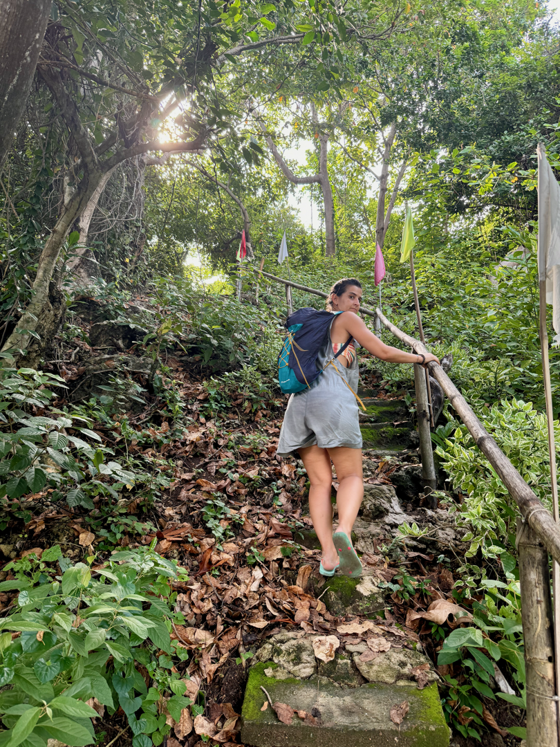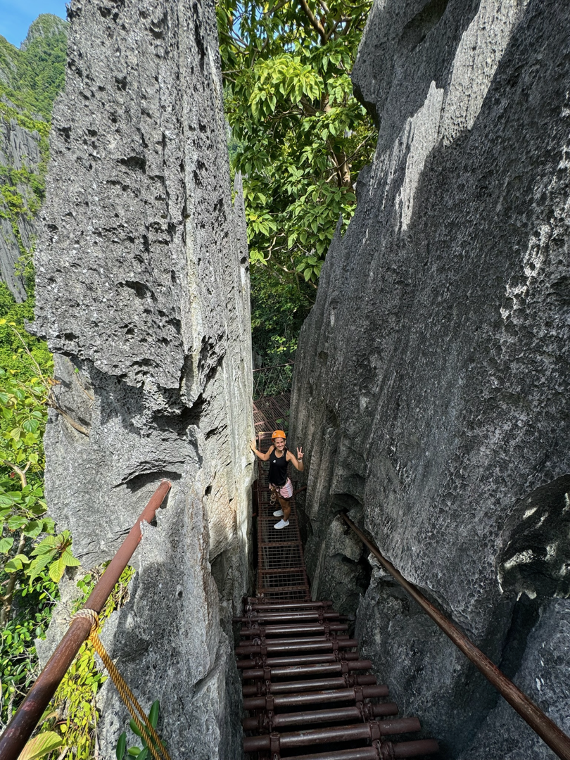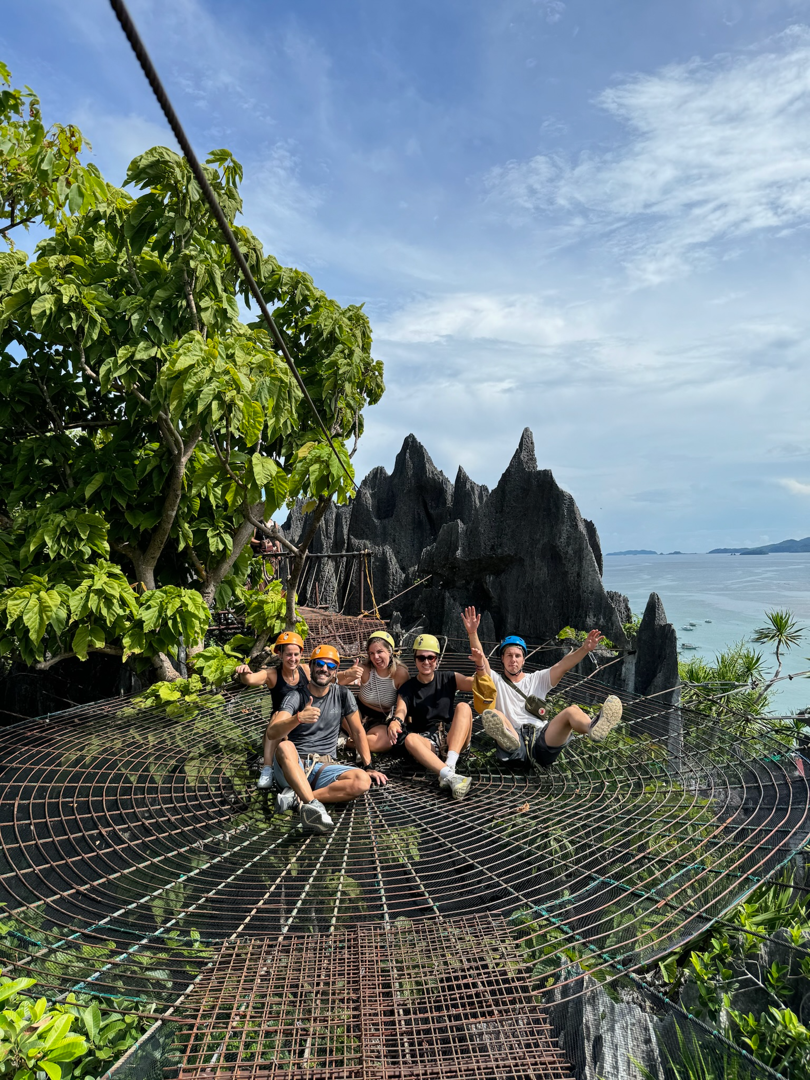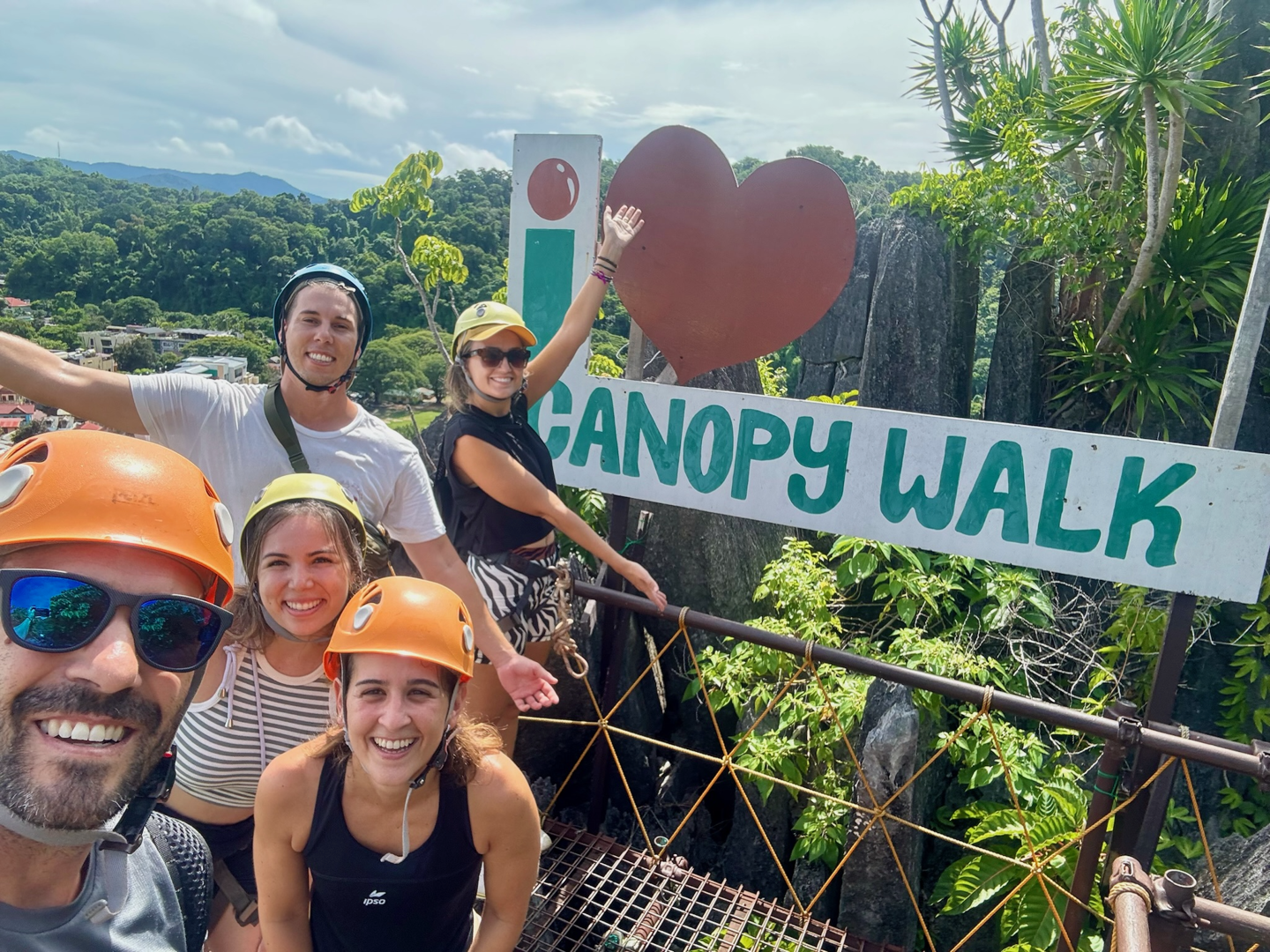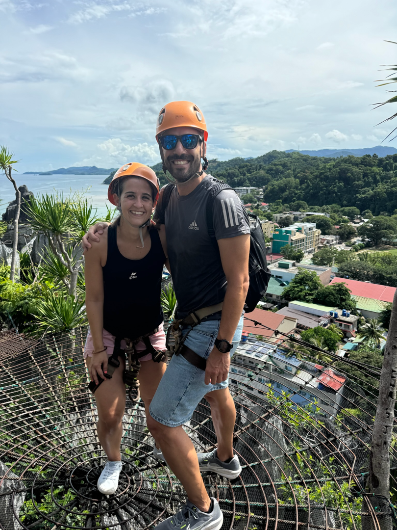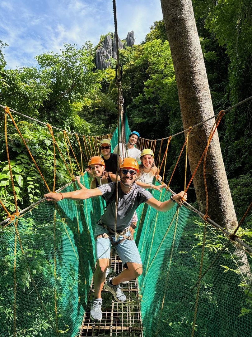 El día empezó con una actividad tranquila pero muy agradecida: la Canopy Walk, una vía ferrata sencilla pero con vistas espectaculares sobre El Nido. Puentes colgantes, pasadizos estrechos, zonas donde tumbarte para hacer fotos y disfrutar del paisaje… fácil, pero muy resultona.