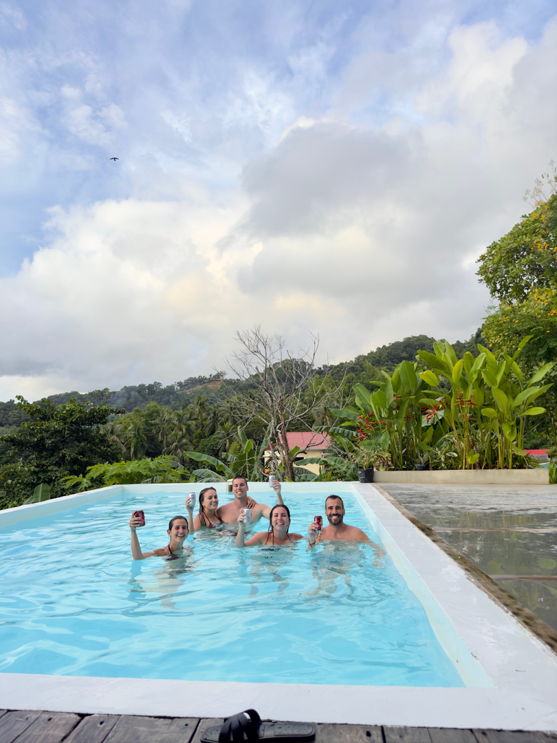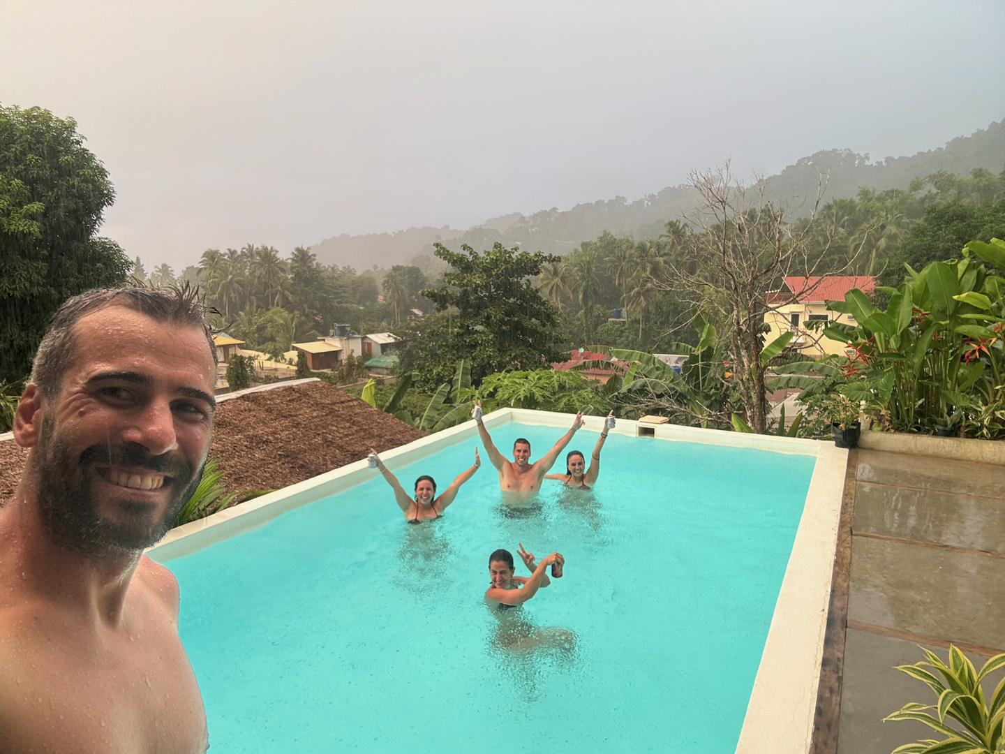 De vuelta en el hotel, tocaba disfrutar de la piscina privada. Y como si el día no pudiera mejorar más, nos cayó un chaparrón de los buenos. Piscina, lluvia tropical y cero prisas… cómo lo gozamos.