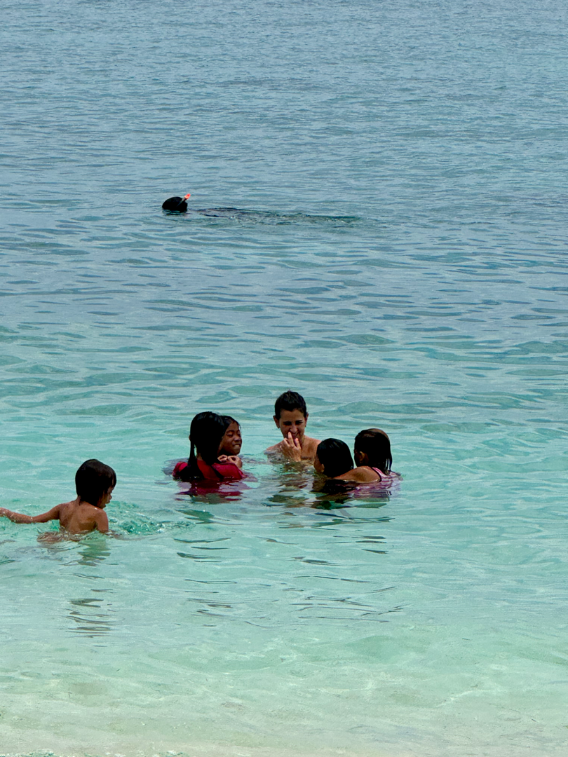 En North Beach, lo de relajarnos duró poco 😅. Mientras nos bañábamos, se nos acercó un grupo de niños con ganas de jugar y curiosear, así que el ambiente fue más animado que tranquilo.
