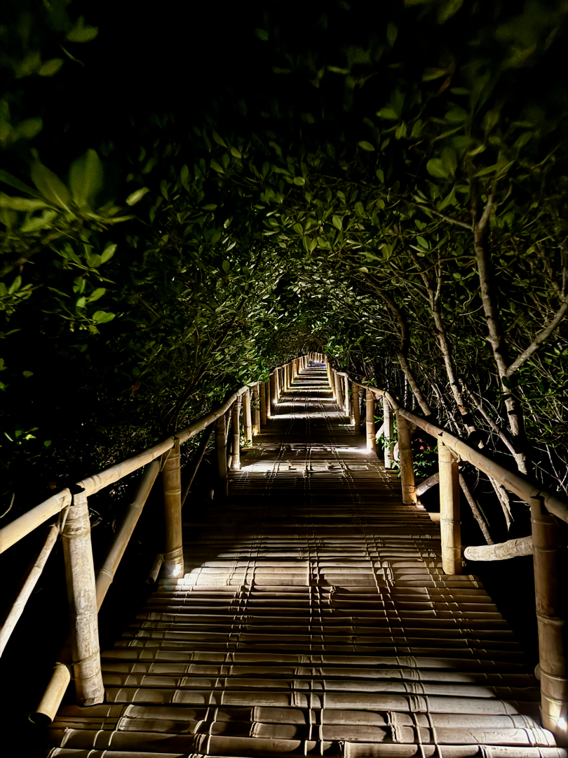 Para llegar al mirador hay que cruzar una pasarela de madera que atraviesa un manglar. Solo ese paseo ya merece la pena: vegetación cerrada, silencio y el sonido del agua acompañando cada paso.